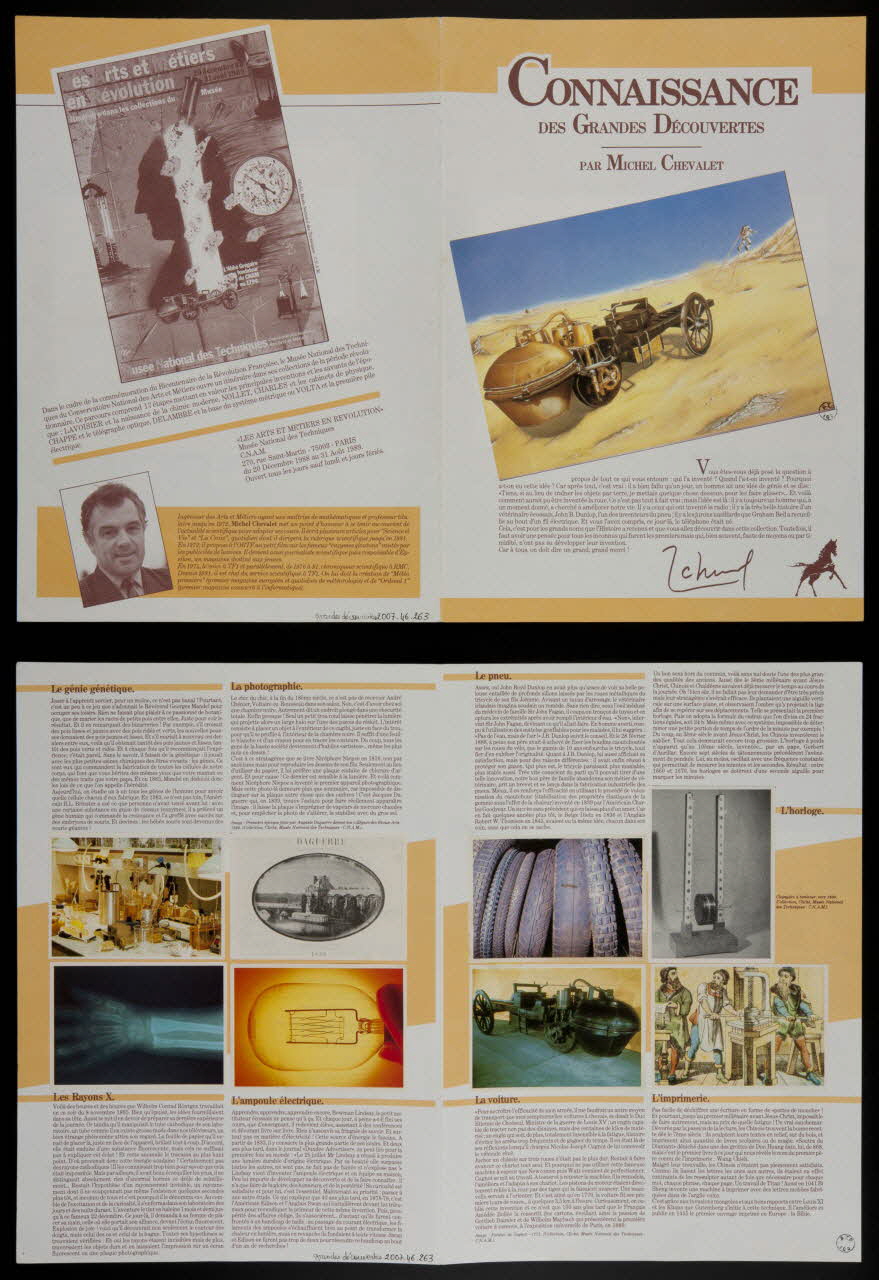 - Scènes : découverte, feu, charrue, boussole, roue, automobile, imprimerie, horloge, avion, moteur, téléphone, chocolat, vaccination, photographie, énergie électrique, machine