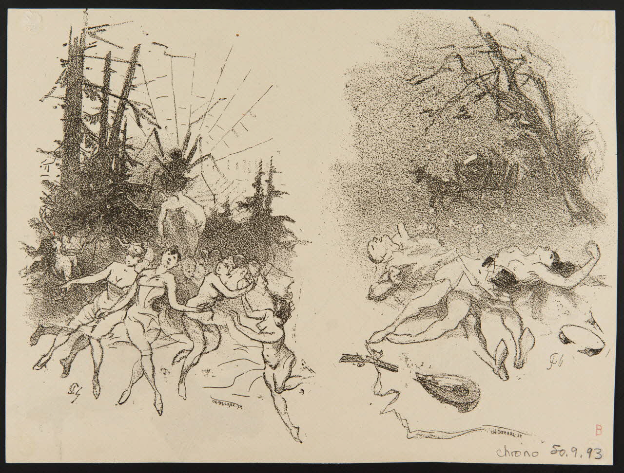 - Scène : homme : cadavre, pistolet, femme, verre : coupe, costume, champagne, jeu : carte, homme, femme, couple, cadavre, vielle : cassé, tambourin