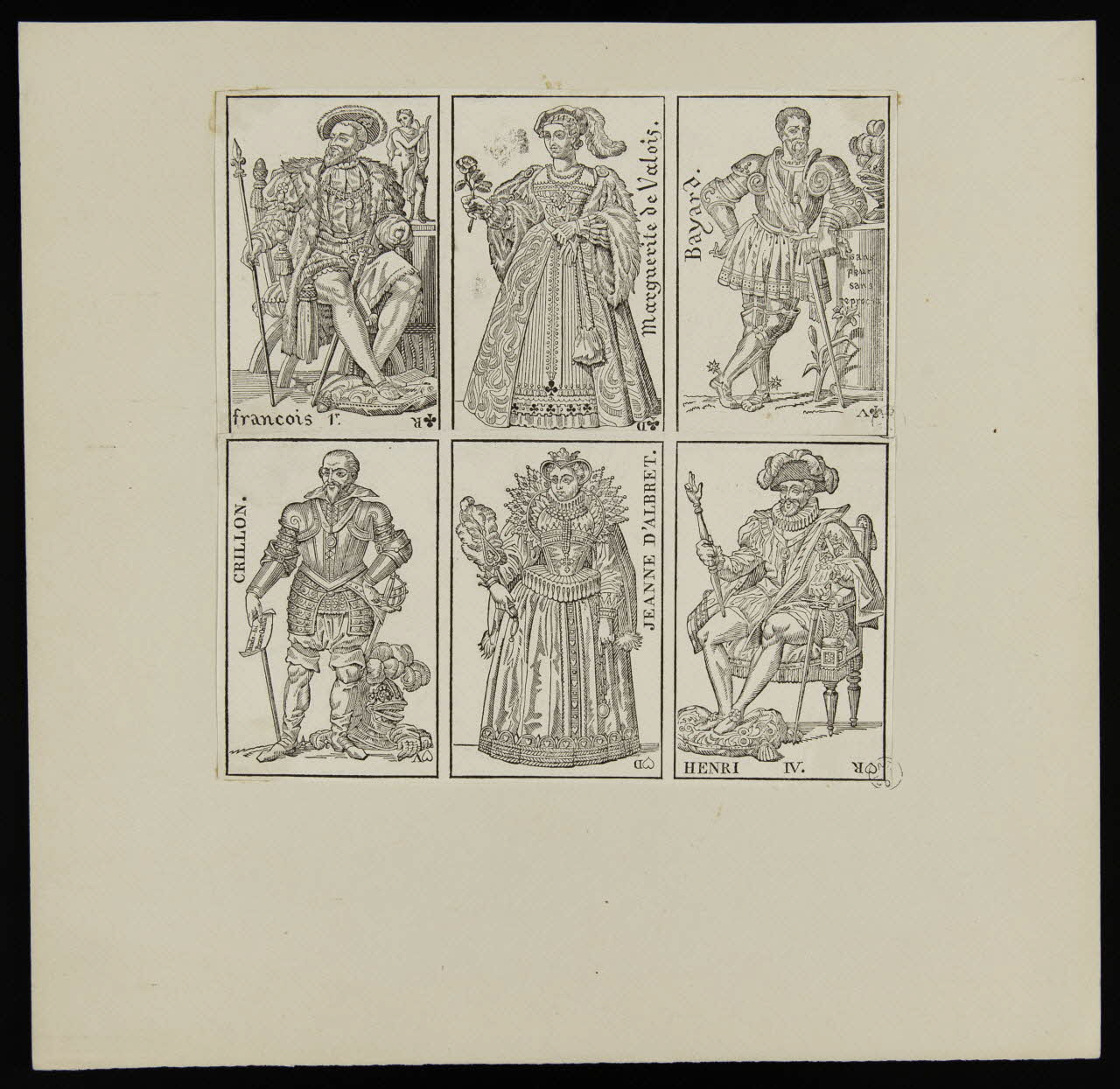 - Portrait : François Ier, assis : trône, sceptre, Marguerite de Valois, en pied, rose, Bayard, en pied, accoudé : colonne, fleur de lys