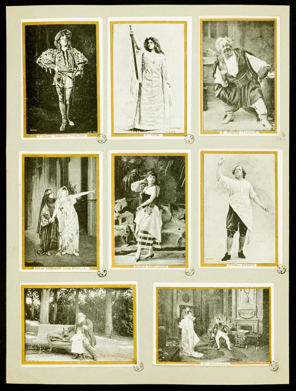 - Scène : theatre, femme : comedienne : Bernhardt, costume : Antique, toge, robe, decor : colonne