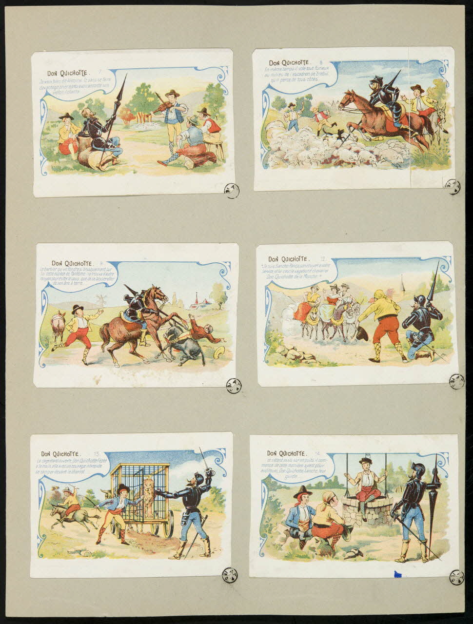 - Scène : Don Quichotte : à cheval, attaque, homme : assis : ane : chute, Sancho Pança