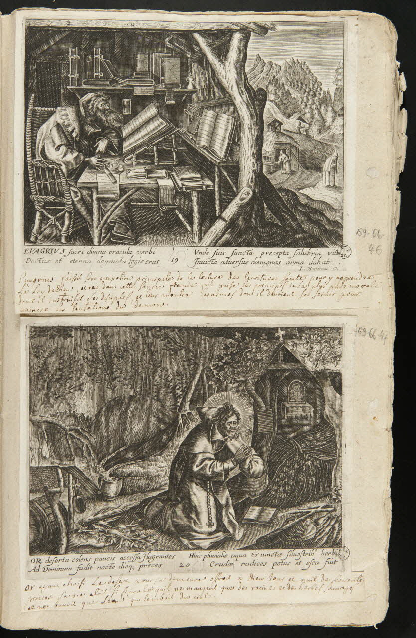 - Scène : homme : saint, agenouillé, prière, costume religieux, chapelet, auréole, idole, chapelle, forêt, cruche, livre : ouvert