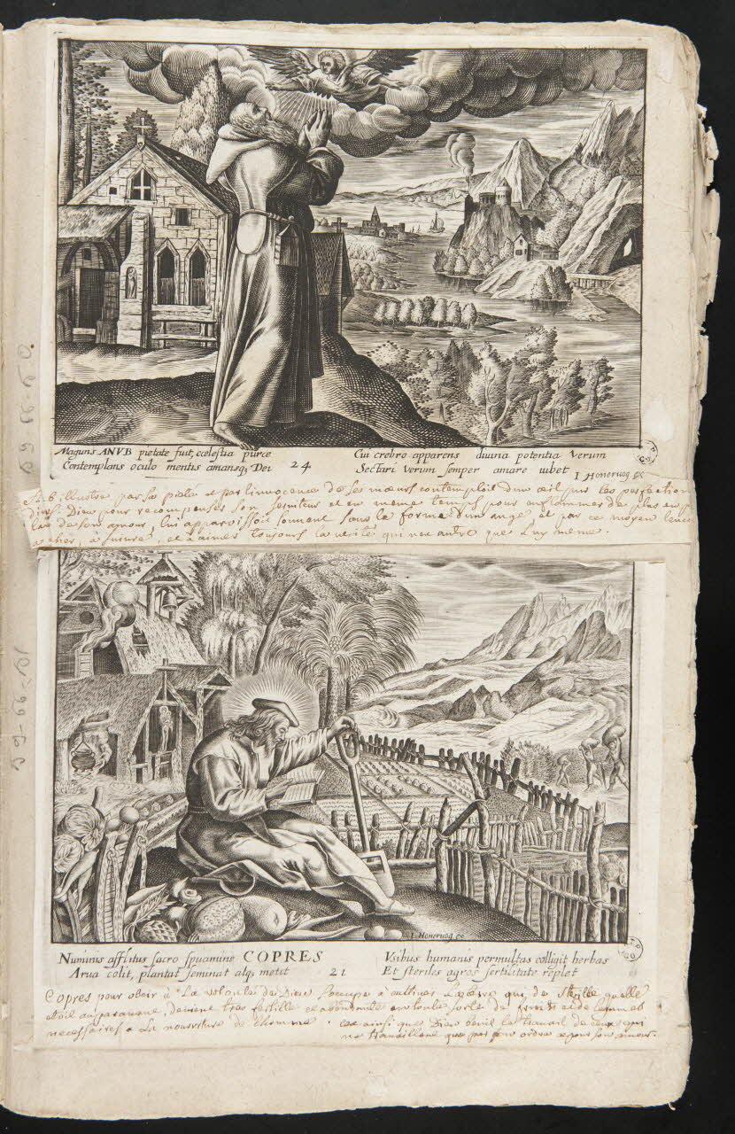 - Scène : homme : saint, assis, jardin : légume, pelle, enclos, maison : idole, marmite, préparation des aliments, jardinier