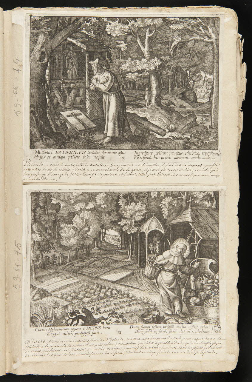 - Scène : saint Fiacre de Meaux, de dos, en pied, auréole, jardin, jardinier, chapelle, forêt