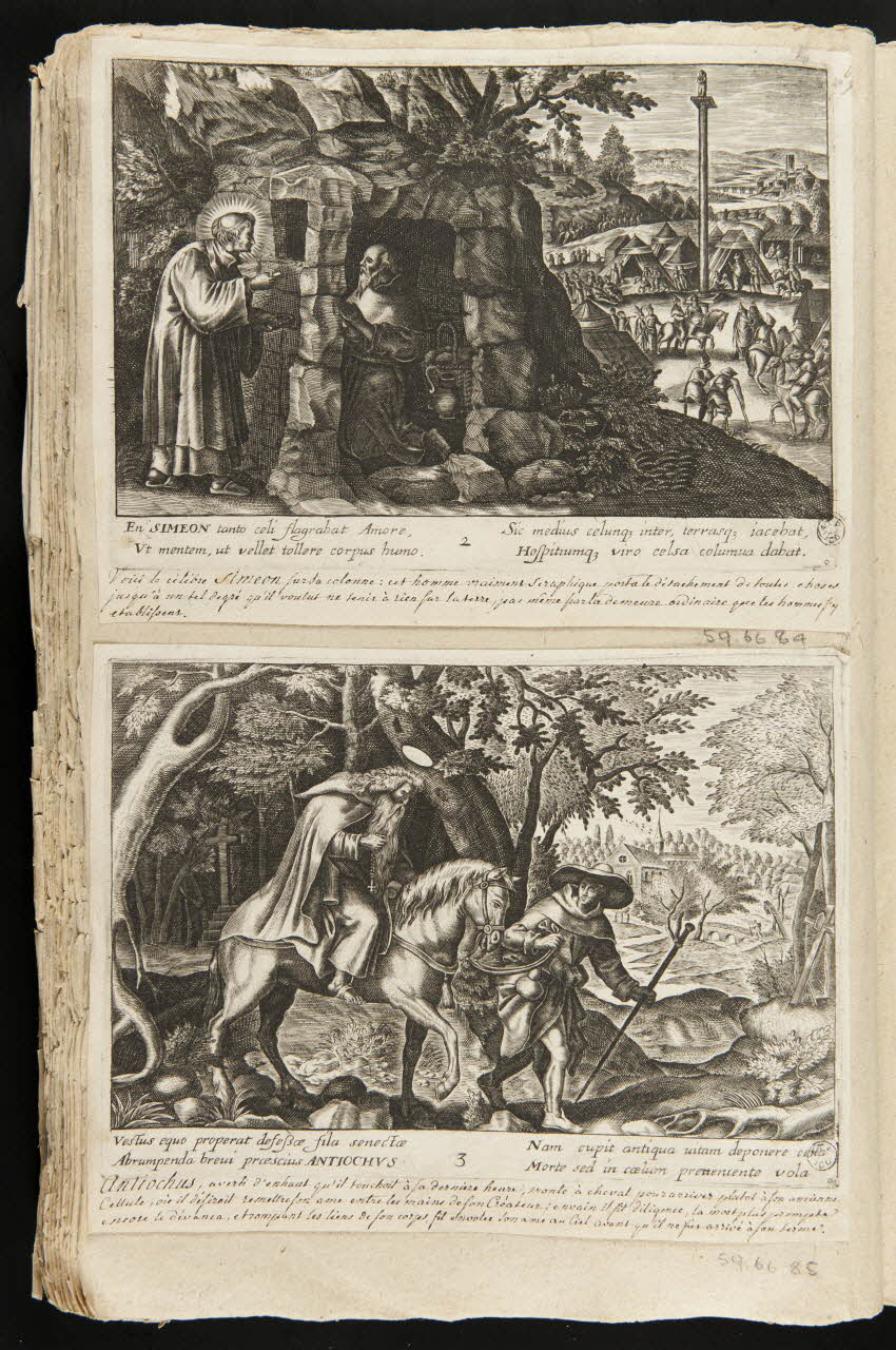 - Scène : homme : saint, auréole, chapelet, transport à dos d'animal : cheval, pélerin, guide, croix monumentale, forêt, église, ruisseau, pont