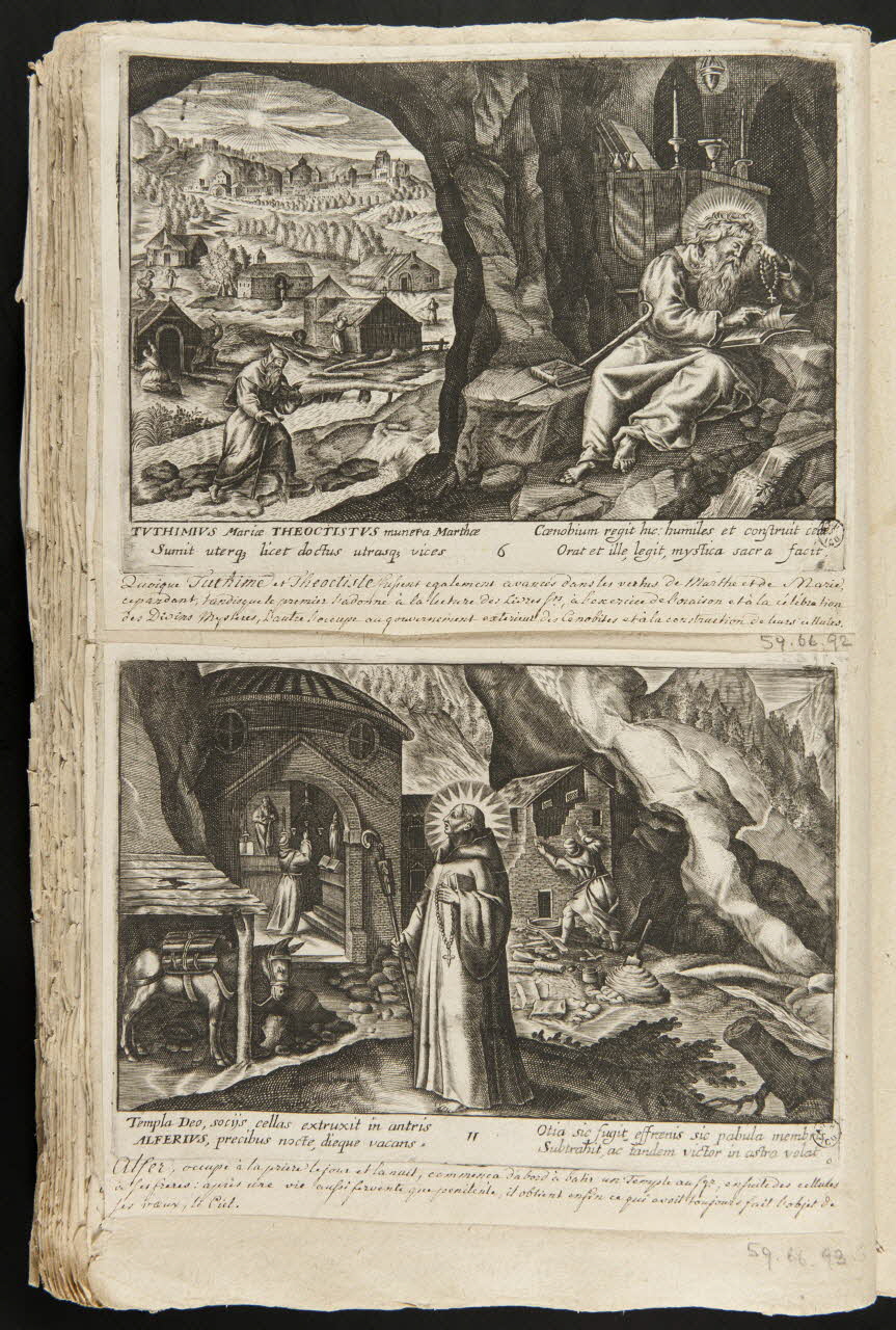 - Scène : homme : saint : auréole, assis, lecture, chapelet, livre, prière, autel, chandelier, bougie, grotte