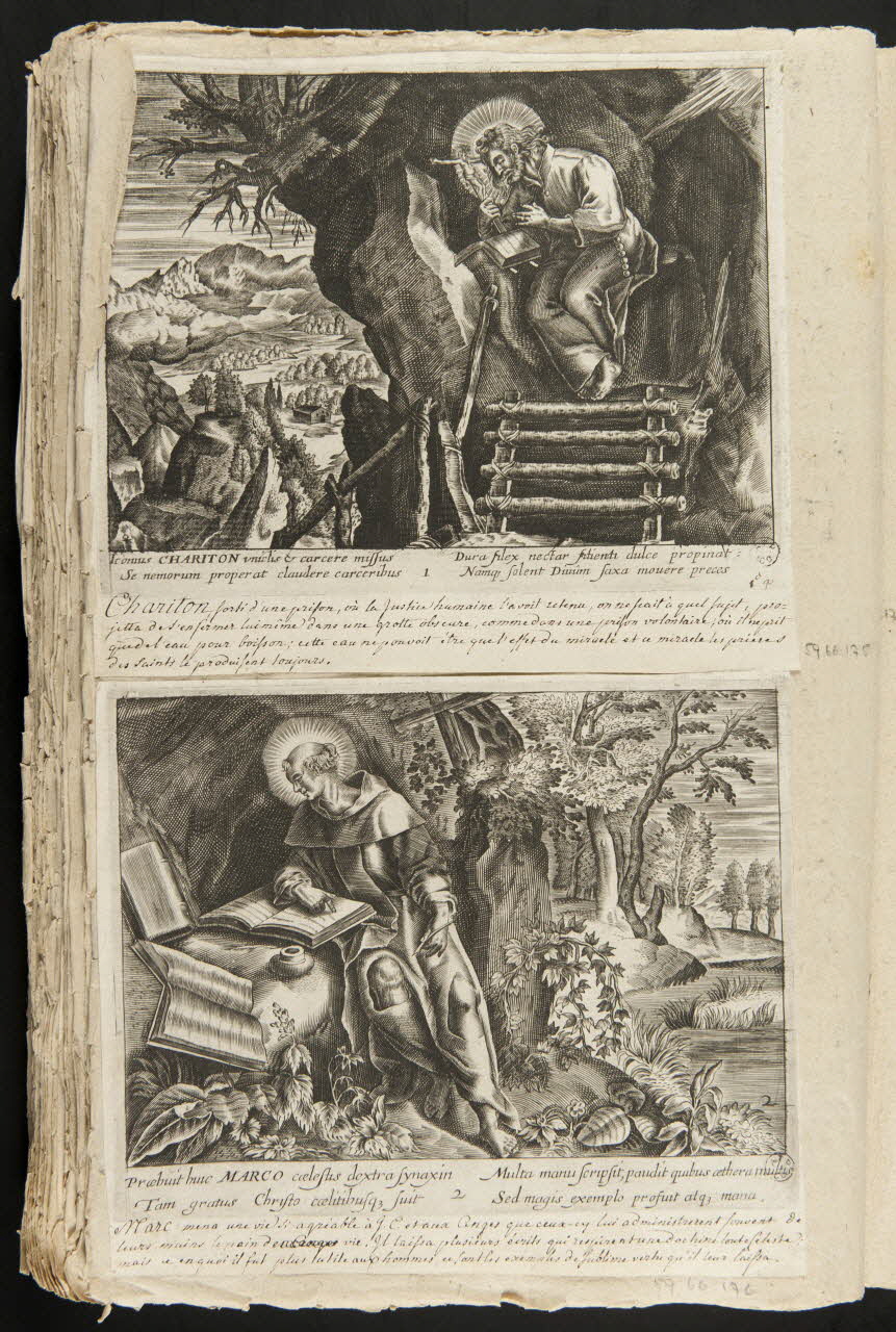 - Scène : homme, haillon, auréole, livre : ouvert, encre, encrier, plume, écriture, grotte, ermite, forêt, végétation, arbre