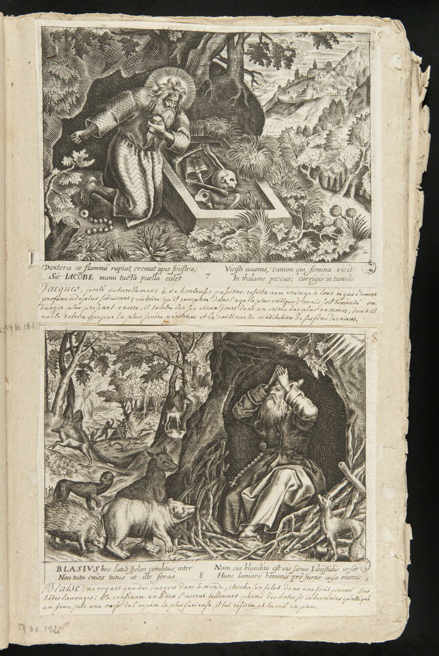 - Scène : homme, auréole, agenouillé, vieillesse, chapelet, tombeau, squelette, os, grotte