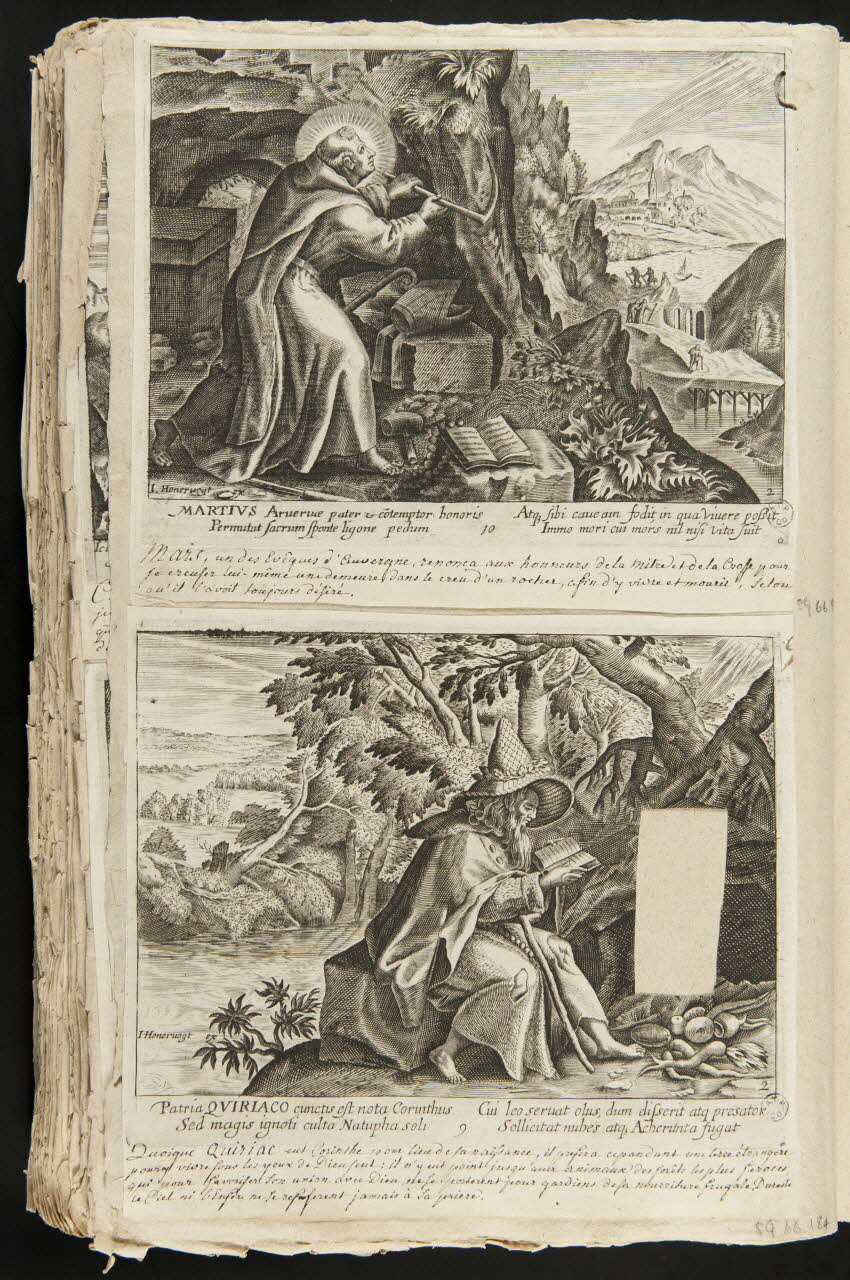 - Scène : homme, assis, haillon, chapeau, barbe, chapelet, livre : ouvert, forêt, rivière, ermite