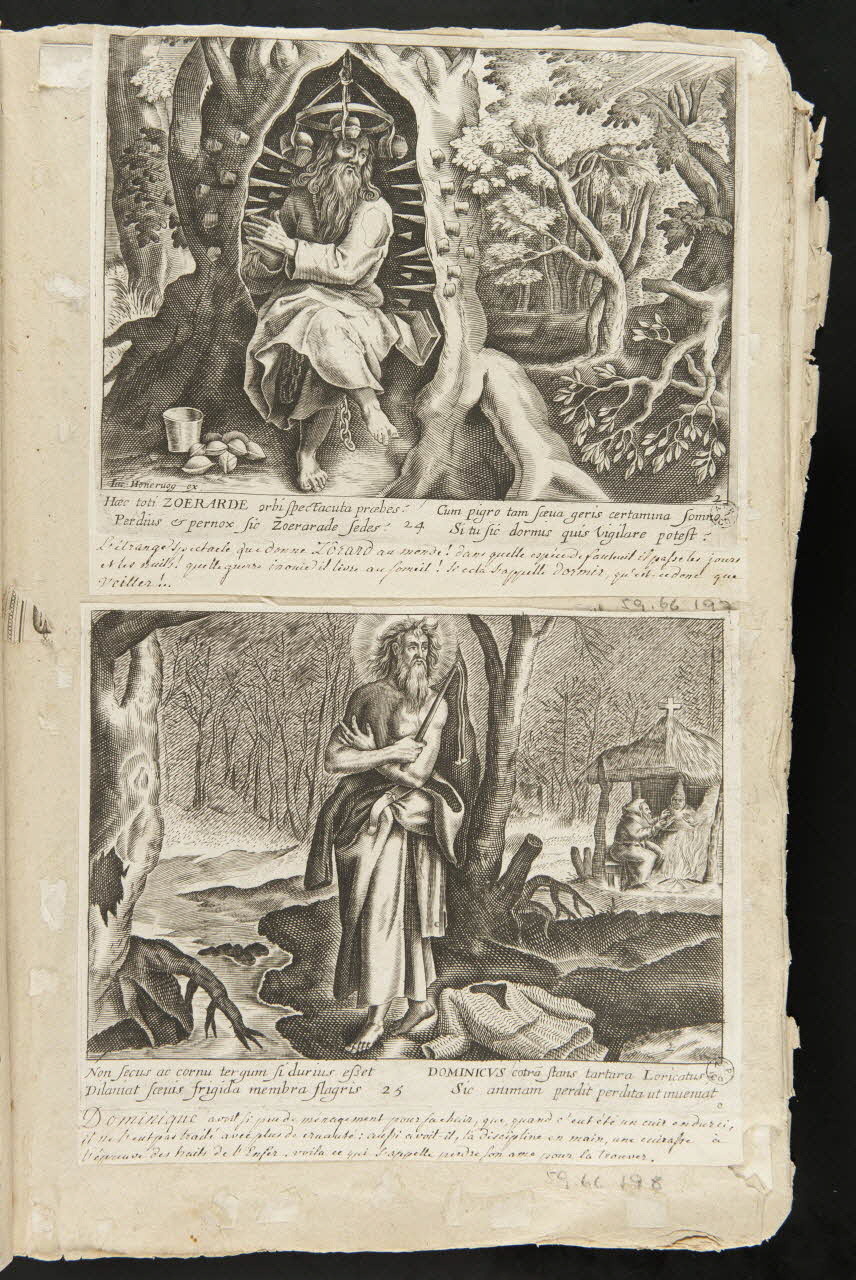- Scène : homme, assis, arbre : tronc, chaine, prisonnier, piège, livre : ouvert, prière, haillon, forêt