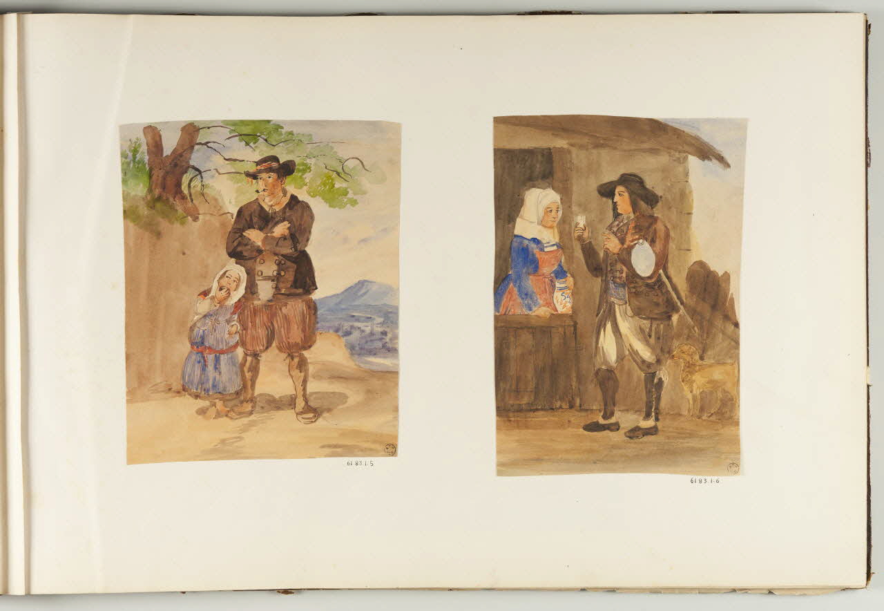 - Scène : homme, en pied, de face, costume traditionnel : Bretagne, chapeau, pipe, fillette, pomme