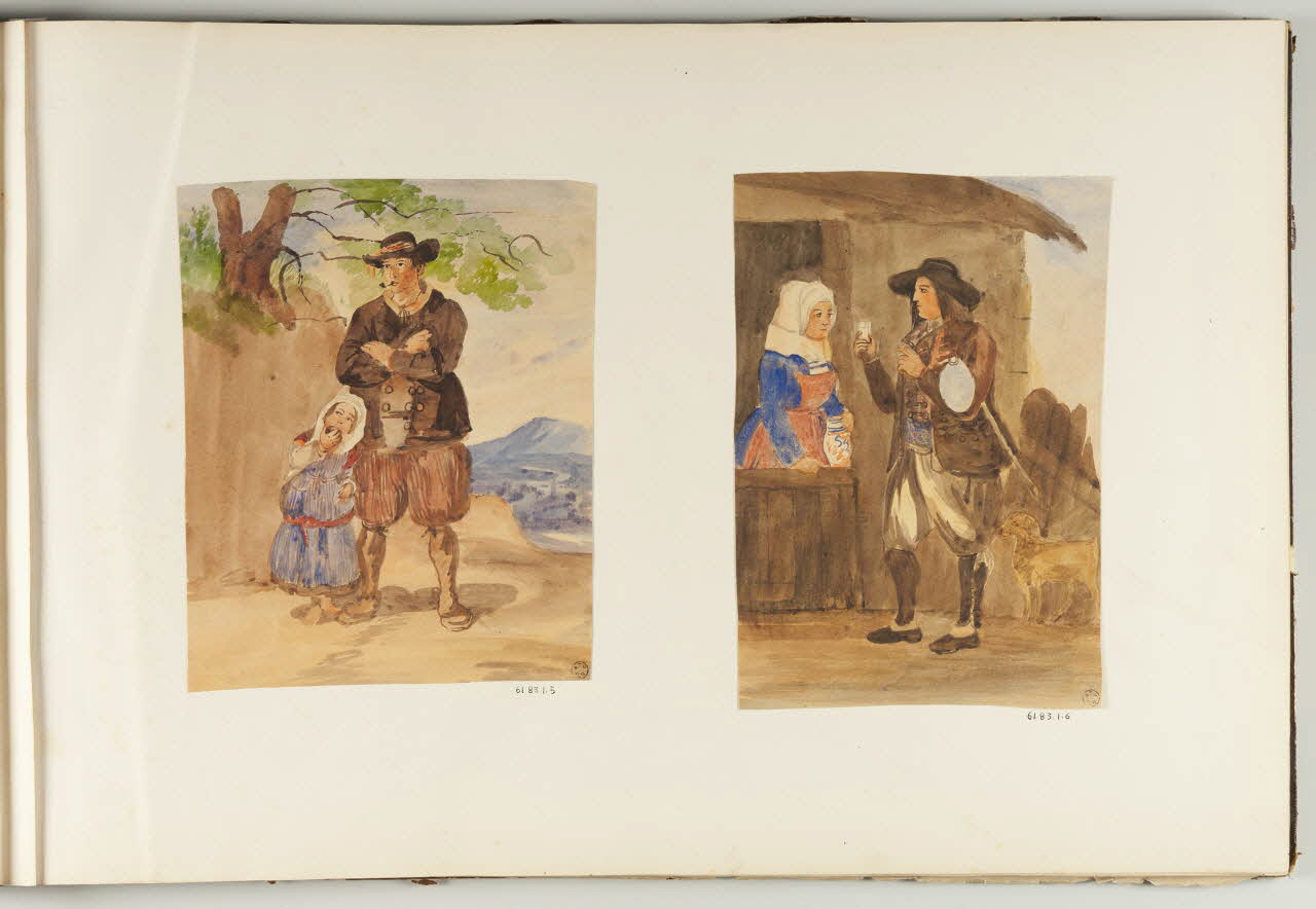 - Scène : homme, en pied, costume traditionnel : Bretagne, verre, femme, en pied, coiffe, cruche, auberge, aubergiste, débit de boisson, chien