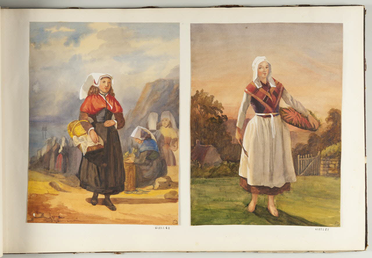 - Portrait d'inconnu : jeune fille, en pied, pied : nudité, costume traditionnel : Bretagne, panier : légume, coiffe