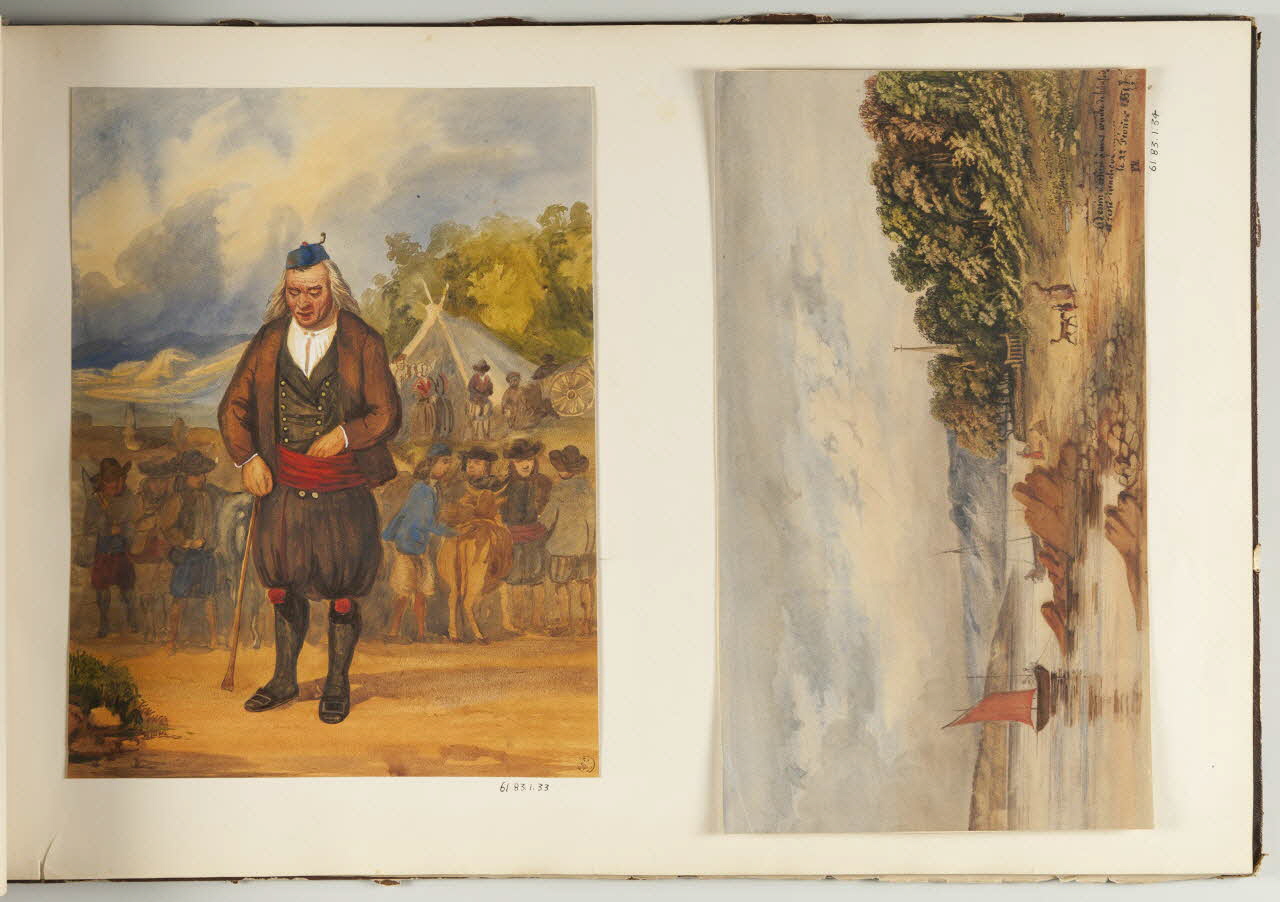 - Portrait d'inconnu : homme, en pied, de face, costume traditionnel : Bretagne, canne, groupe de figures : homme, vache, tente, charrette