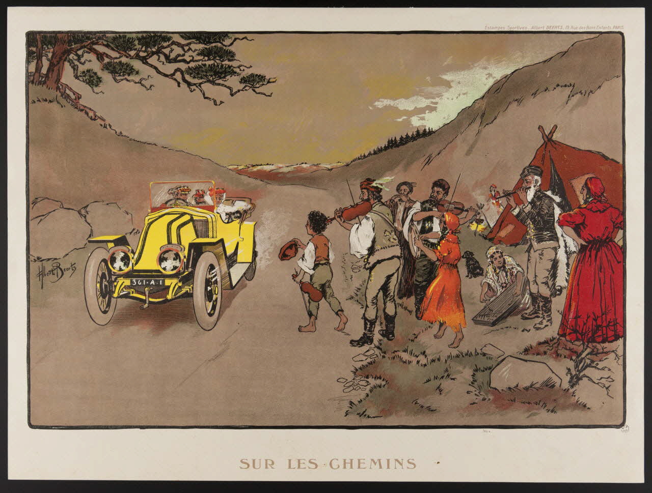 Cette estampe met en scène de part et d'autre d'une route de campagne trois automobilistes (deux hommes et une femme) à bord d'une voiture jaune et un groupe d'hommes, de femmes et d'enfants dont la plupart jouent de la musique. On distingue à droite une tente à côté de laquelle une femme fait bouillir une marmite.Inscriptions