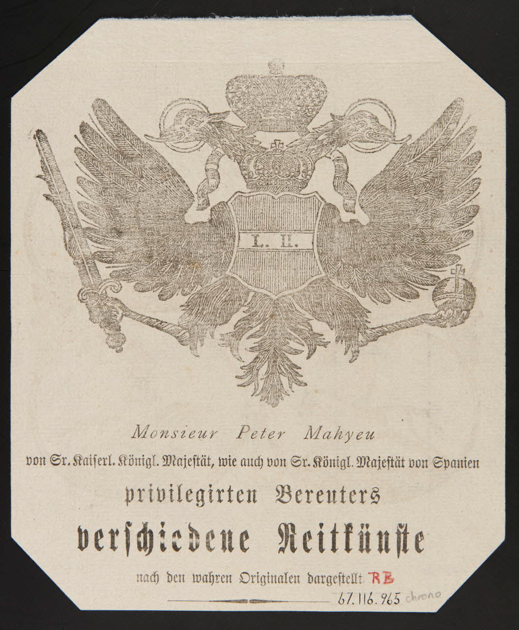 - Scène : en médaillon, homme, cheval, acrobatie, casque, plume, drapeau