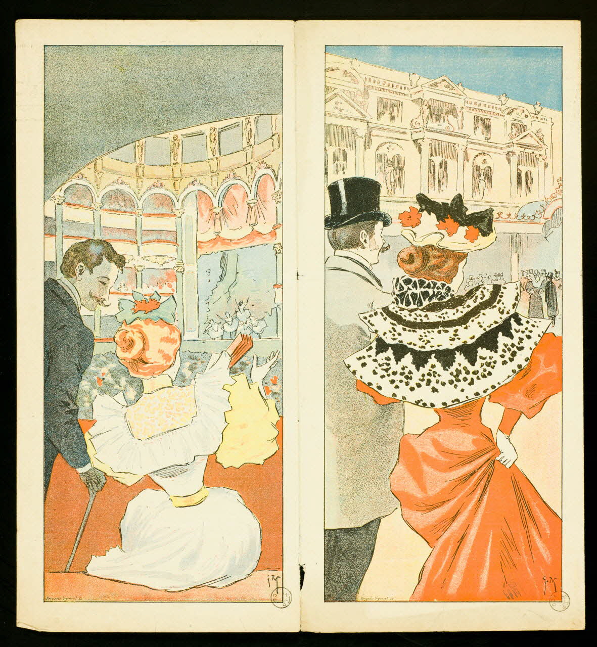 Lithographie en couleurs / Trois volets : femme et clown, couple de dos, couple au théâtreDécor