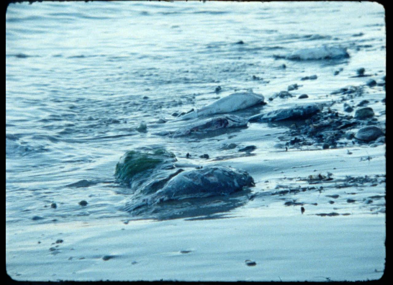 L'oeuvre débute par la vue d'une table, dans le style des nature-mort hollandaises du XVIIe siècle. La table est partiellement recouverte d'une nappe blanche, sur laquelle se trouve une vaisselle diverse en étain - assiettes, couverts, verres d'eau, coupole et pichet. Ces objets se tâchent progressivement jusqu'à être complètement assombris. La seconde partie de la vidéo présente un bord de mer où apparaissent des poissons morts, régulièrement ballottés par les vagues. La troisième partie présente un mur vertical de roches grises, creusé par quelques fissures et dont la surface est progressivement recouverte d'une mousse jaunâtre. La quatrième partie présente un nuage de fumée qui se déplace lentement par filaments : l'émanation obscurcit le ciel et cache le soleil rougeoyant. Photographie : Courtesy de l'artisteDécor