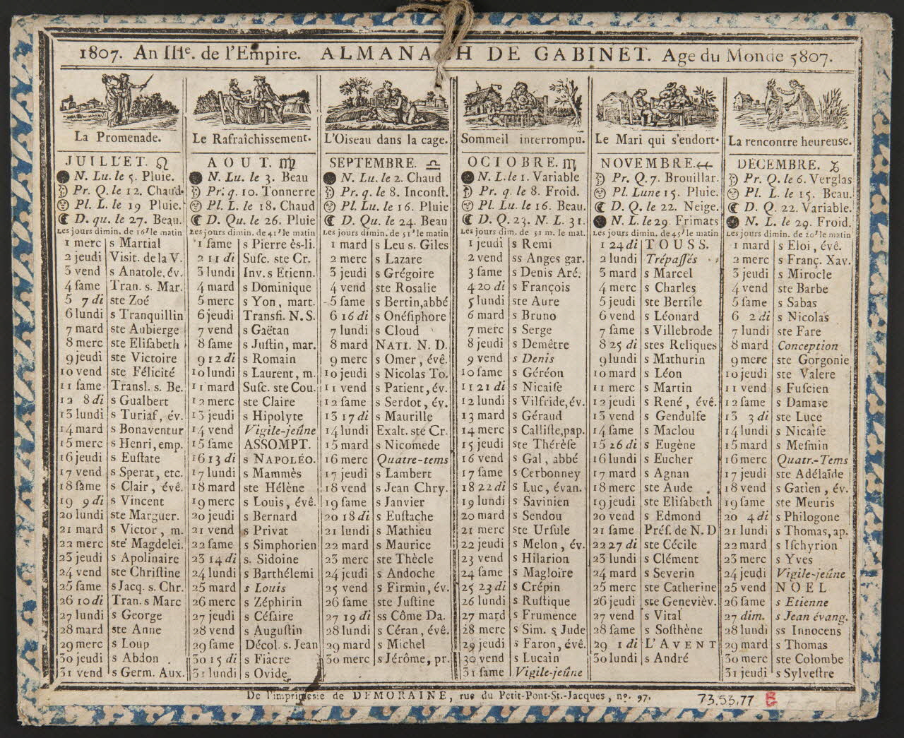 estampe, 1807. An IIIe de l'Empire. ALMANACH DE CABINET. Age du Monde 5807.