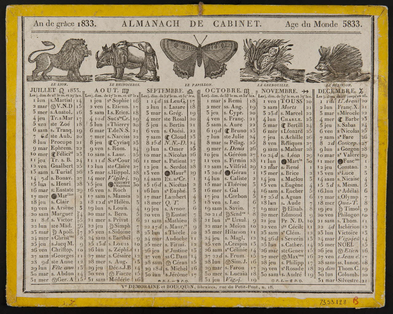 estampe, An de grâce 1833. ALMANACH DE CABINET. Age du Monde 5833.