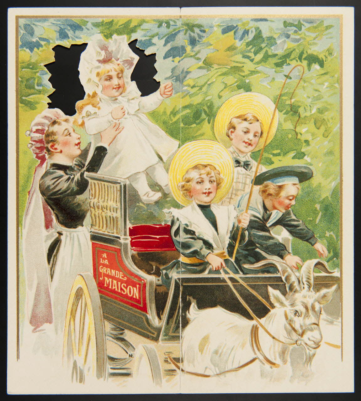 Représentation de trois enfants dans une calèche tirée par une chèvre et d'une femme en habit de gouvernante tenant dans ses bras une fillette en robe de baptême. Sur le côté de la calèche, mention " A la grande maison".Décor