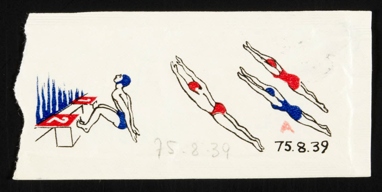 - Revers : scène : groupe : homme, plonger, piscine, saut, bonnet