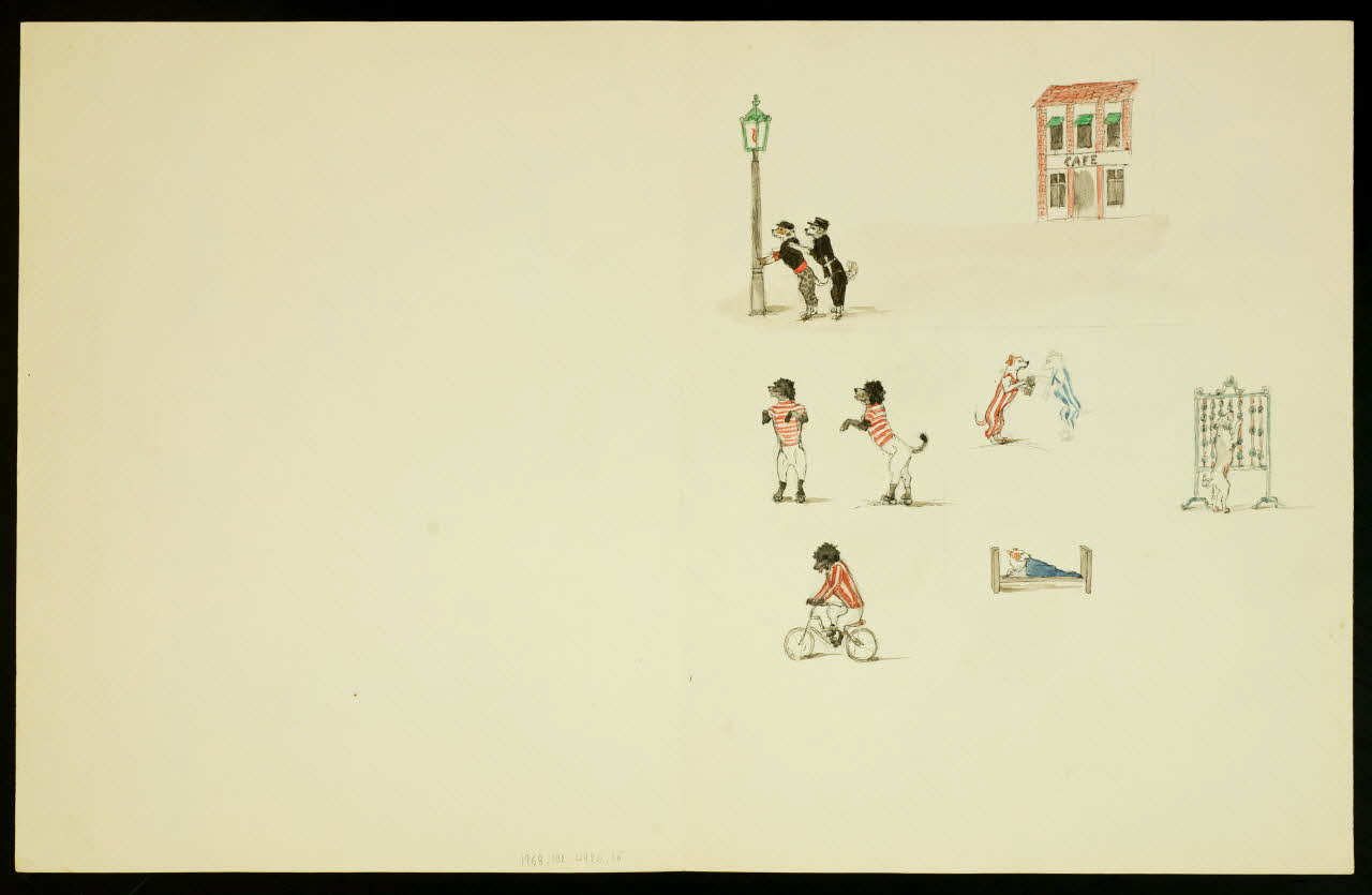- Scènes : chien, vêtement : humain, bicyclette, lampadaire, bâtiment : café