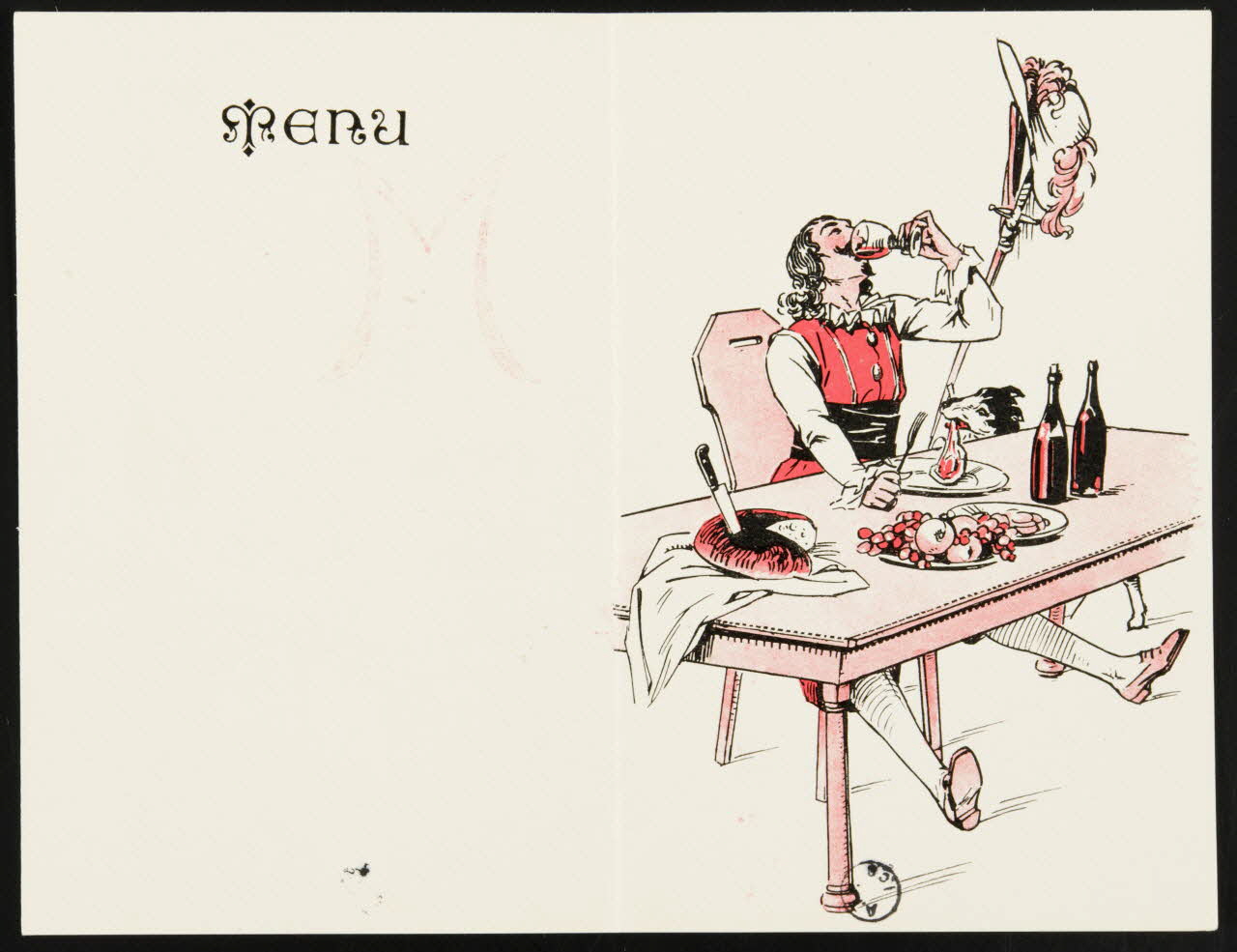 double page ; homme à table buvant ; à l'intérieur, menuDécor