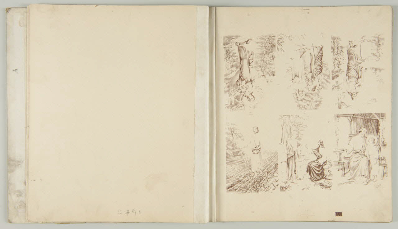 - Scène biblique : Jésus, auréole, champ, graine, puits, chemin, fleur, enfant