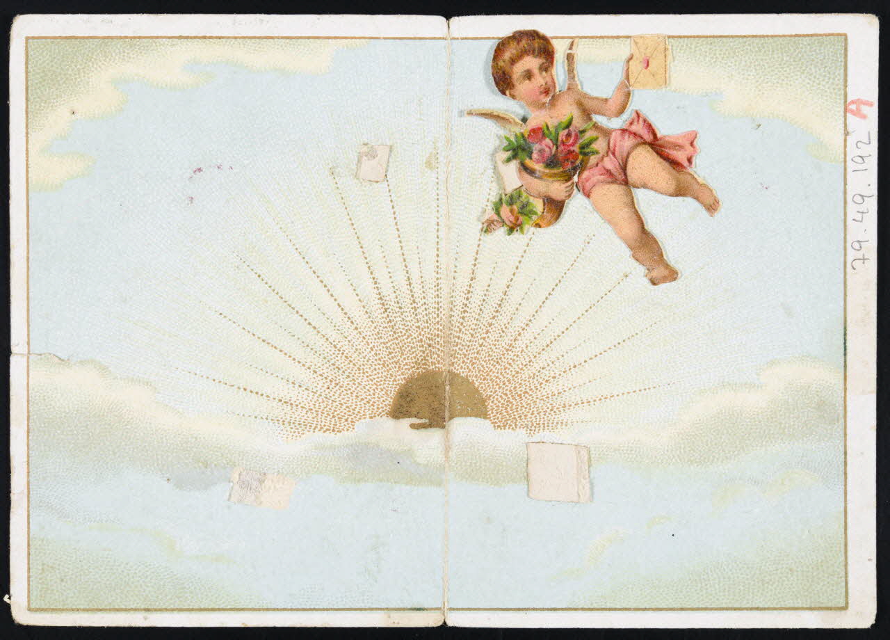 - Figure : angelot, portant : corne d'abondance, lettre, soleil, rayons lumineux, nuage