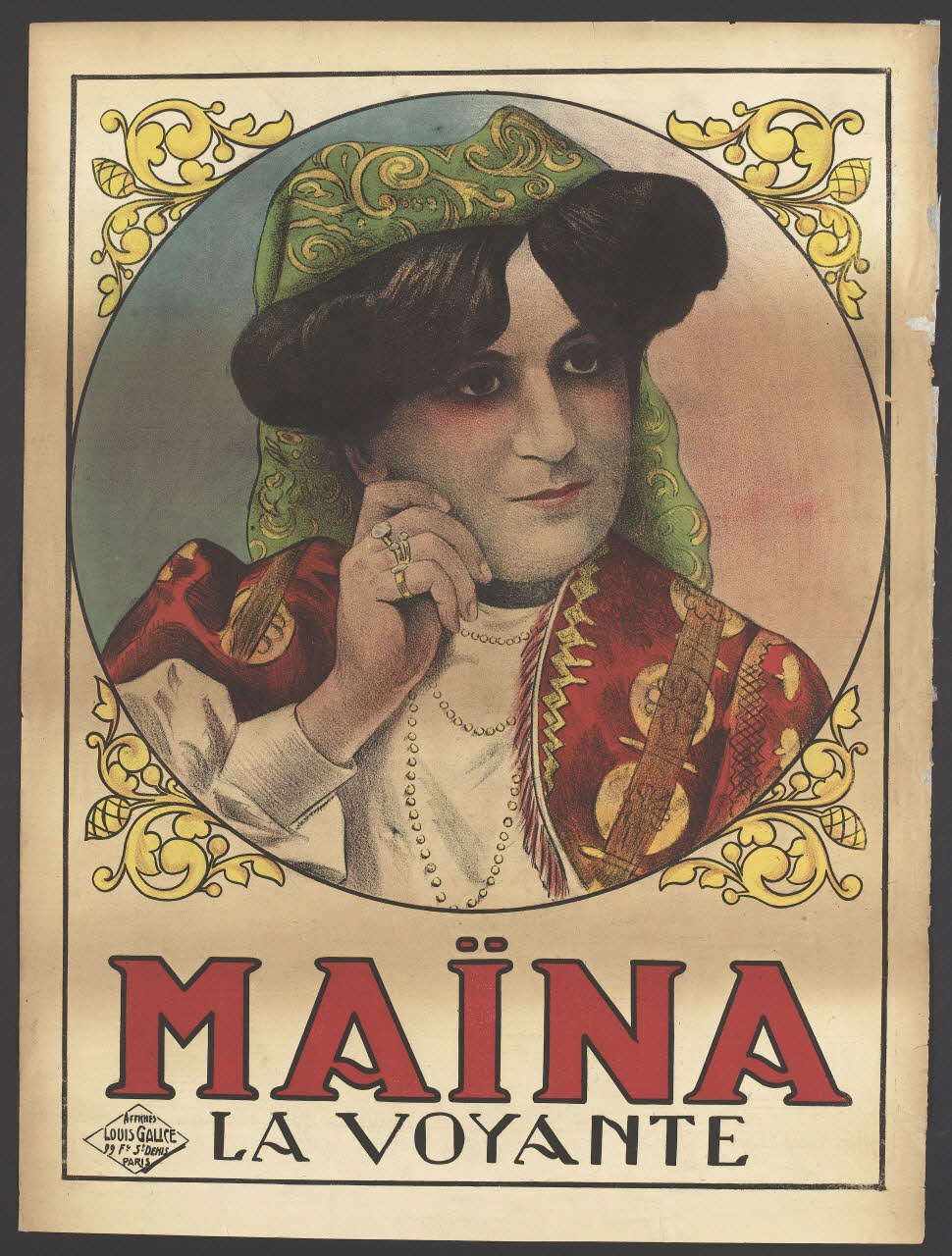 Affiche en couleur représentant dans un médaillon le portrait d'une femme. Sous le médaillon est portée l'inscription "MAÏNA LA VOYANTE".Décor