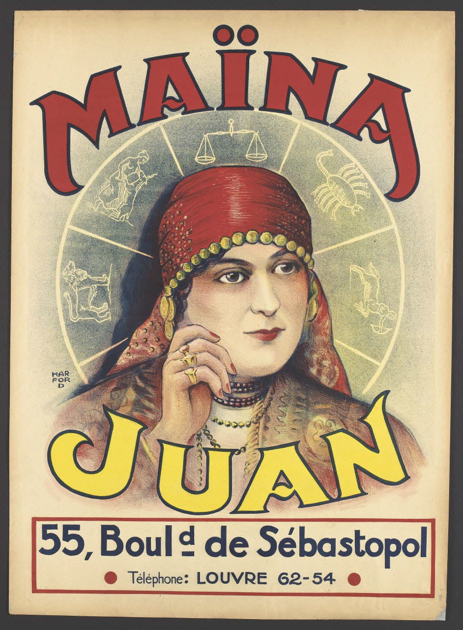Affiche en couleur représentant au centre le portrait d'une femme accompagné de l'inscription "MAÏNA JUAN". Figure derrière elle dans un médaillon des signes du calendier du zodiaque (Lion, Vierge, Balance, Scorpion et Sagitaire).Décor