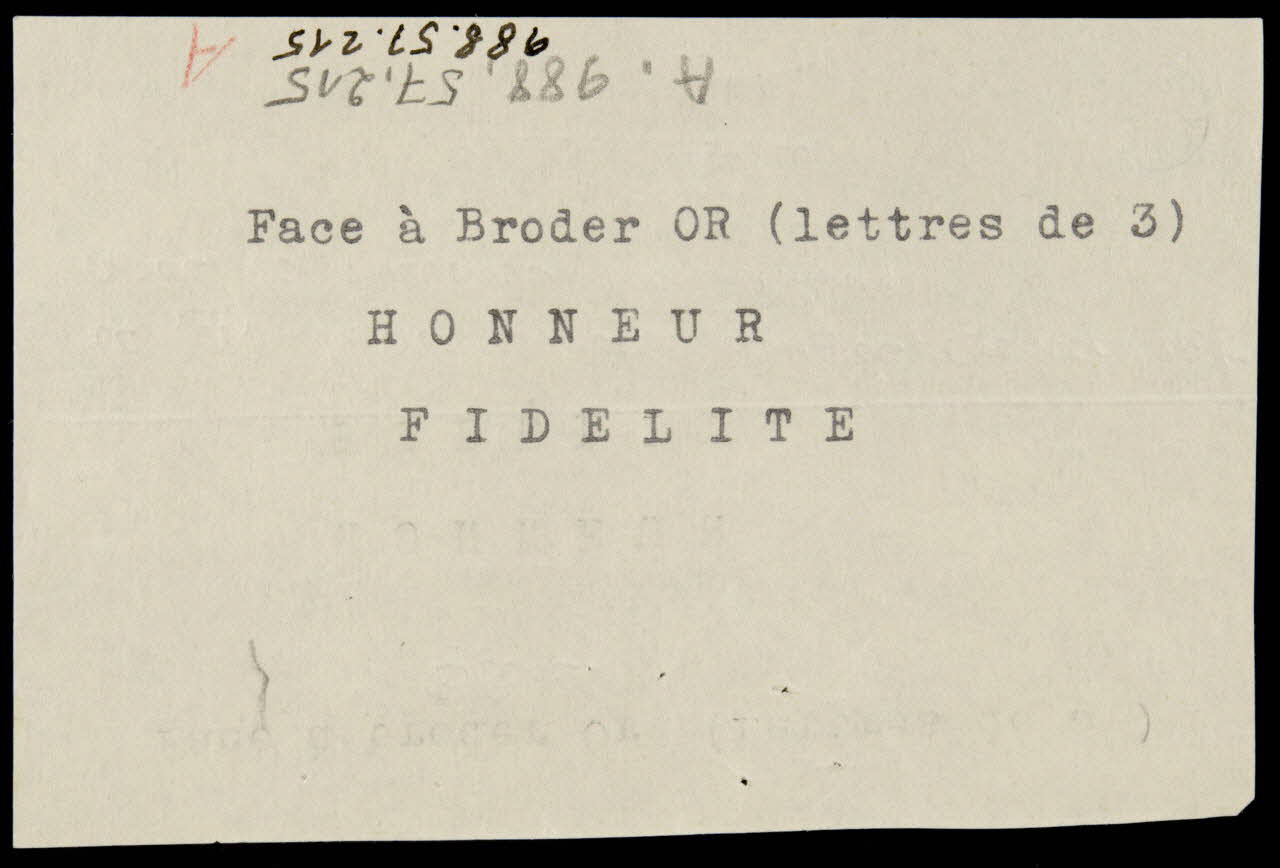 papier, encre bleue et rouge / fanion sous inscription tapée à la machine "Face à broder Or (Lettresde 3) Harka de mechtrass"Décor