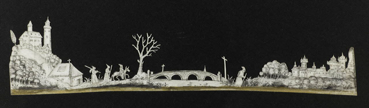 - Paysage : montagne, château, pont, croix, moine: profil, arbre, rivière, canard, âne, maison