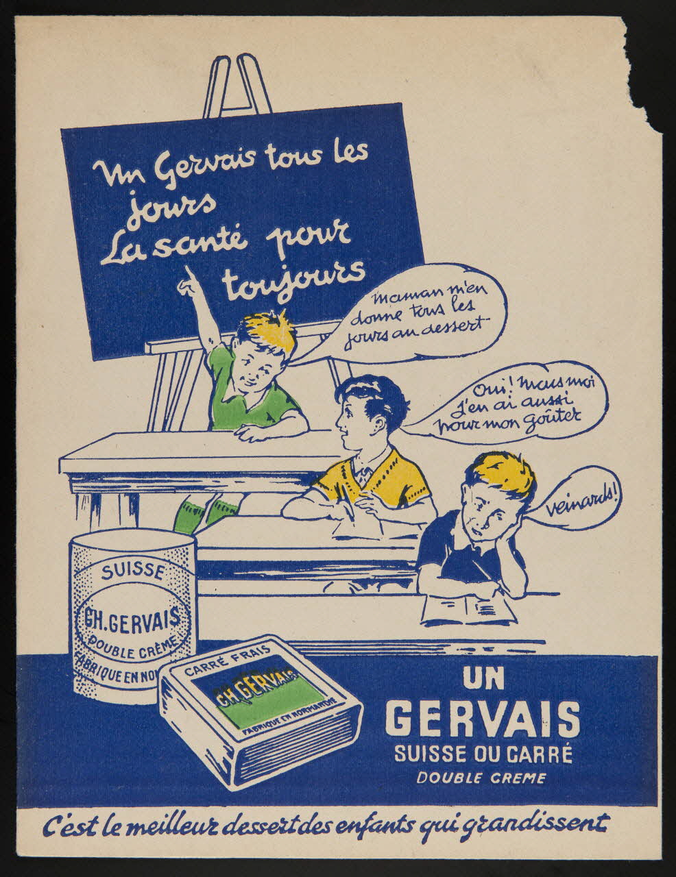 - Revers : scène : garçon : écolier, tableau, discussion, boîte : fromage