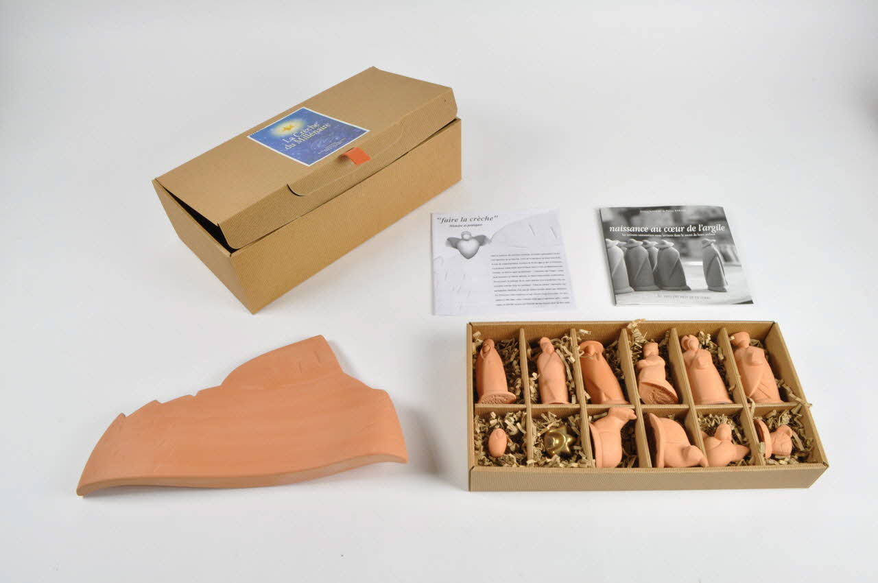 Le décor et les figurines sont en terre cuite de couleur naturelle. Boite en carton. L'emballage est conçu pour accueillir le décor, les figurines et le catalogue. Crèche en terre cuite conservée dans une boîte en carton spécialement adaptée (.1 et .2) avec livrets de présentation (.3 et .4). Derrière un fond sineux représentant la silhouette du Garlaban (.5), onze personnages : la Vierge, Joseph, l’Enfant et son auréole dorée, l'âne, le taureau, un ange qui s'encastre dans le fond, un berger et son mouton, les trois rois mages. Chaque figurine porte la signature de son fabricant imprimée sous le socle. Le catalogue illustré raconte l'histoire de la création de la crèche. Une notice explicative en indique le montage.Inscriptions