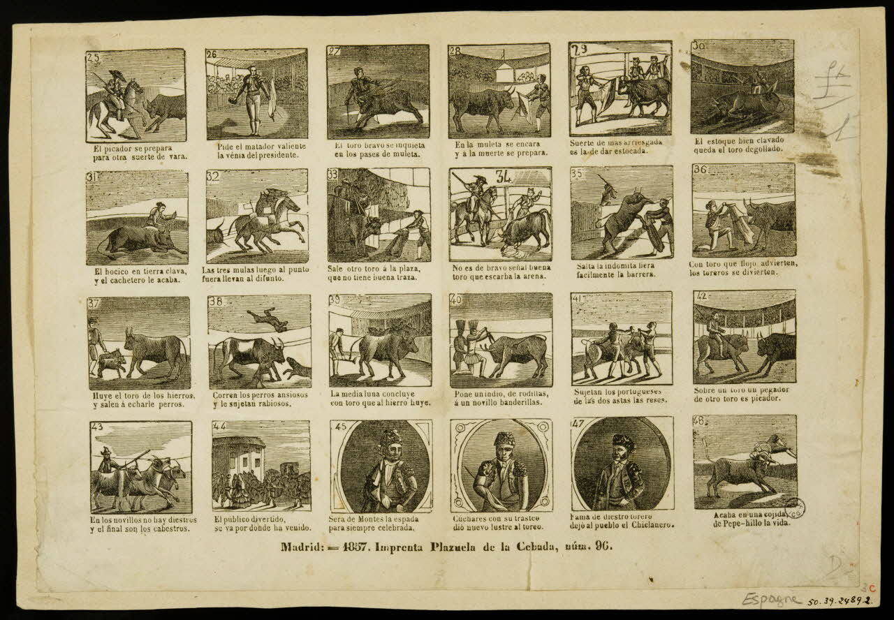 - Suite de scènes : cycle thématique, homme, femme, église, taureau, prière, armée, arêne, torero