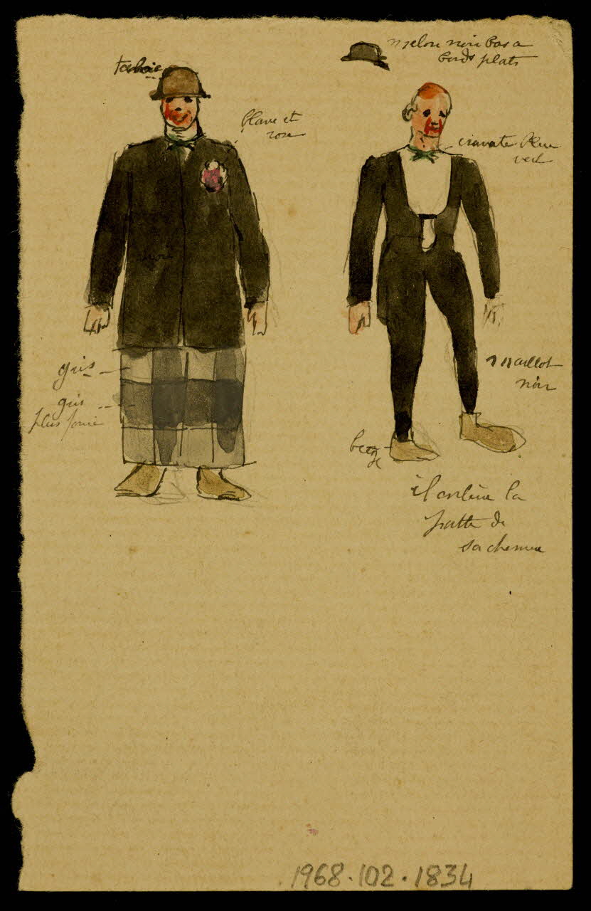 - Figure : clown, en pied, maquillage, costume : cirque, clownerie, homme, en pied, costume : bourgeoisie, homme, en pied, de face, manteau, homme, en pied, costume : bourgeoisie