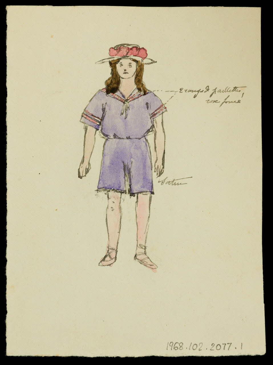 - Figure : jeune fille, en pied, de trois-quarts, robe, chapeau : fleur