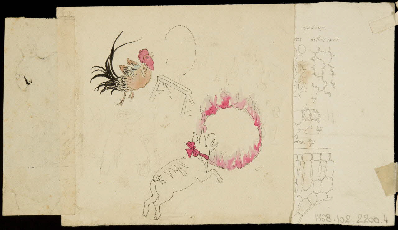 partie d'un ensemble de dessins, Clown et homme assis, Coq et cochon