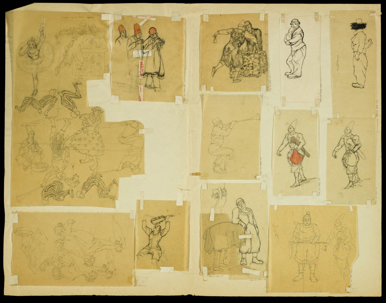 - Figure : homme, marche, costume : clown, chapeau, portant : objet