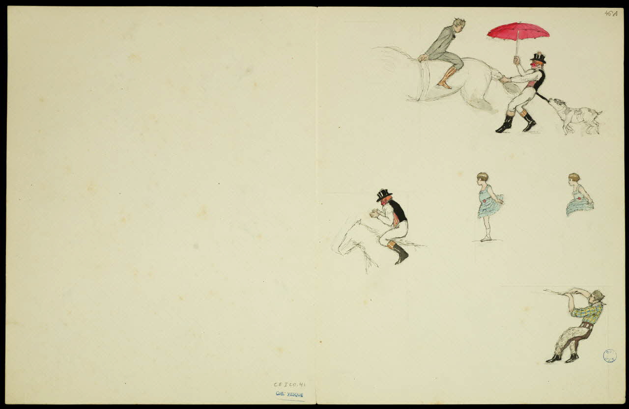 - Scène : clown, bicycle, en appui, en équilibre, acrobatie, clownerie, chat, costume : Anglais, accessoire : balai, art du spectacle, cirque