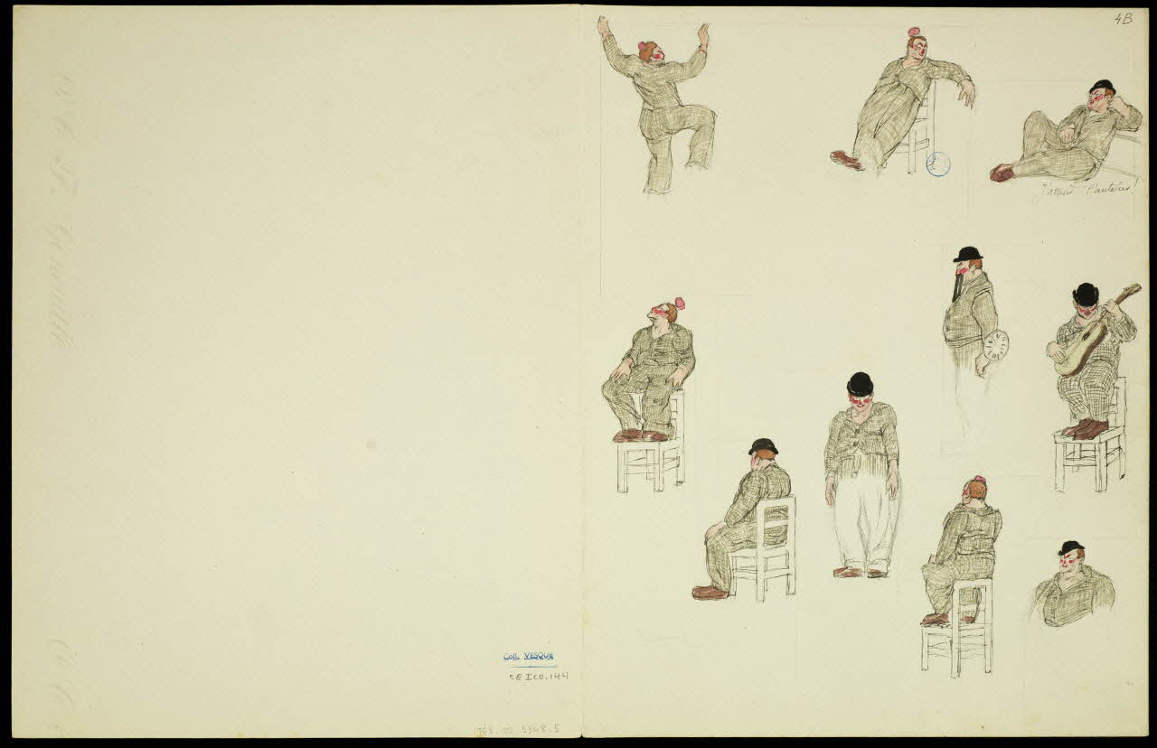 - Revers : scène : homme : clown, assis, debout, de face, maquillage, chapeau, chaise, instrument : musique, guitare, clownerie