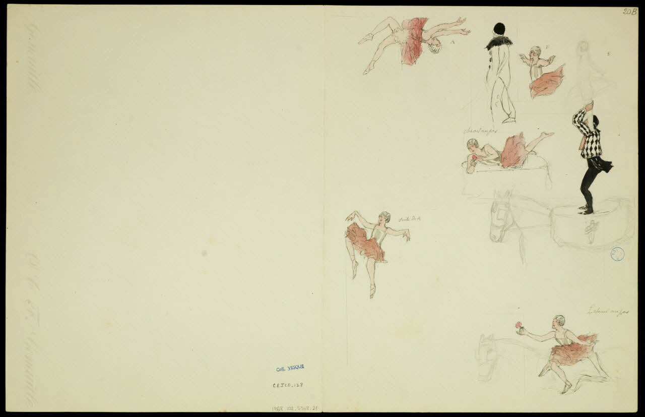 - Revers : scène : homme : clown, femme : acrobate, cavalier, équestre au galop, en équilibre, cheval, acrobatie