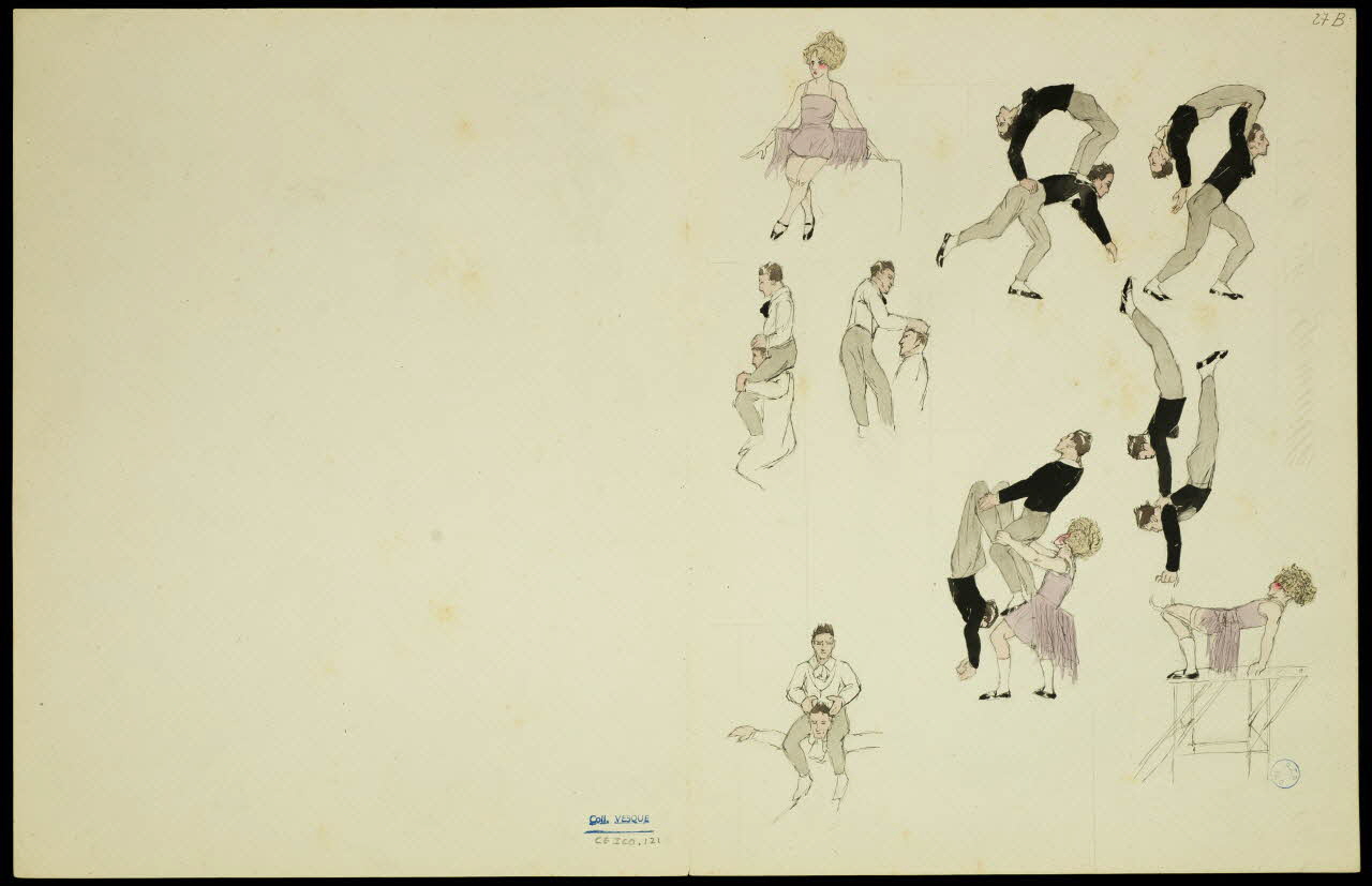- Scène : groupe : acrobate, en équilibre, équilibrisme, bicyclette, instrument de musique : trompette, art du spectacle
