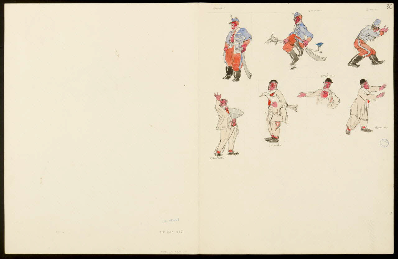 - Figures : homme : costume : soldat, clownerie, art du spectacle : cirque, oie