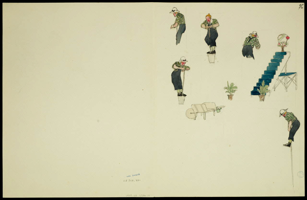 - Revers : scène : homme : clown, pelle, maquillage, plante, brouette, corbeille : fleur, escalier, art du spectacle, cirque, clownerie