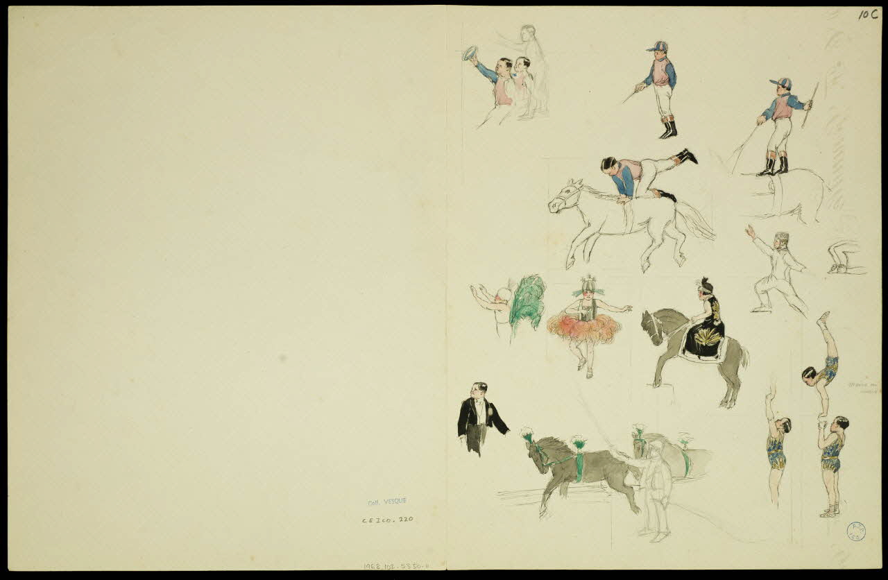 - Scènes : cavalier, jockey, acrobate, dompteur, en appui, en équilibre, cheval, équestre au galop, fouet, acrobatie, art du spectacle, cirque, enfant : danseur, ?, costume : plume