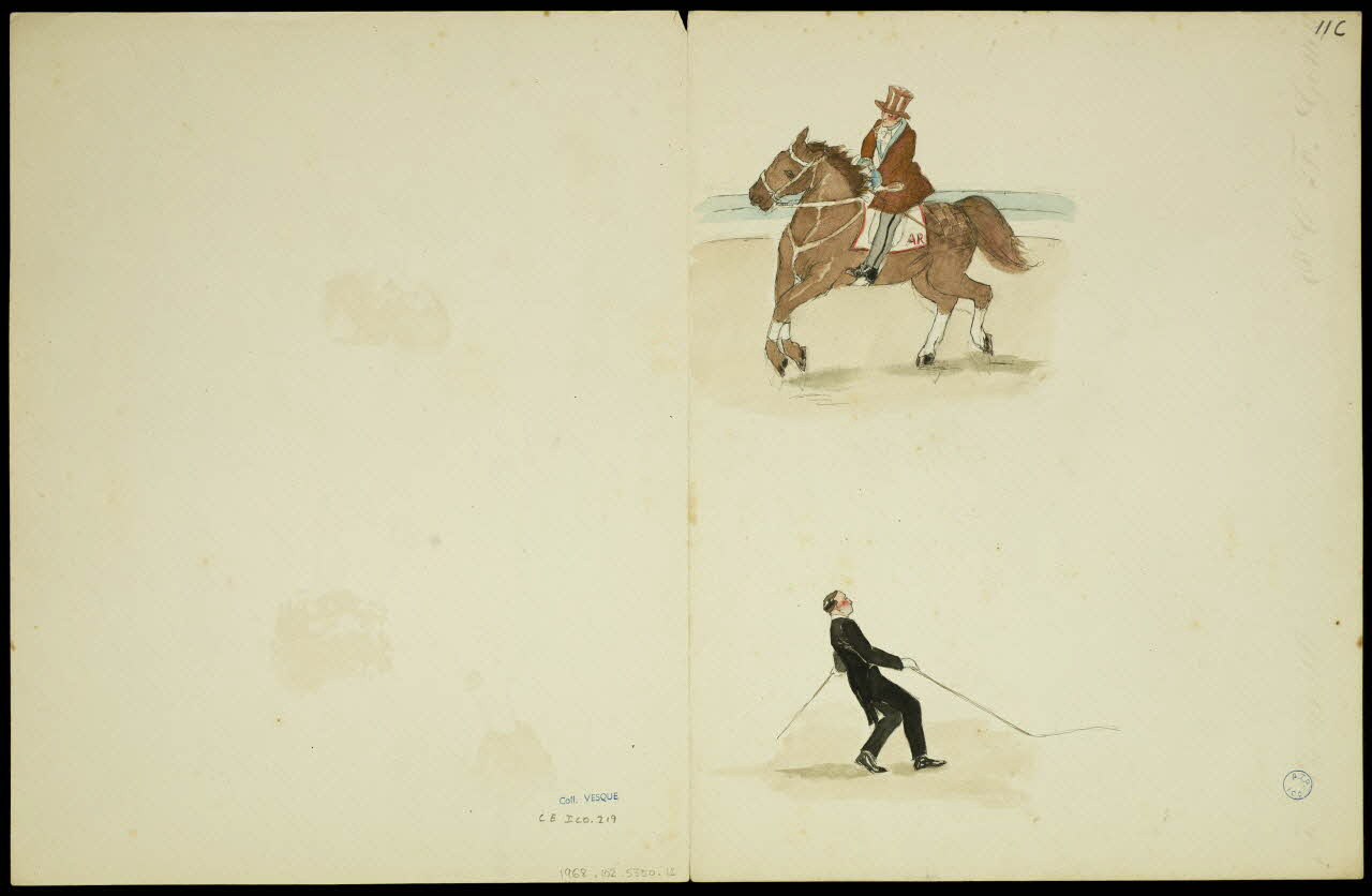 - Revers : scène : homme : cavalier, assis, équestre au galop, attelage, costume : chapeau, cirque, spectacle