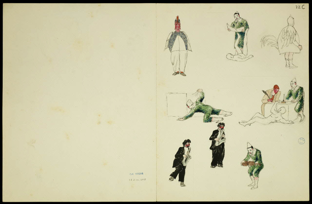 - Scène : homme : clown, musicien, déguisement, costume : déguisement, musique : instrument, saxophone, violon, encrier, maquillage, art du spectacle, cirque